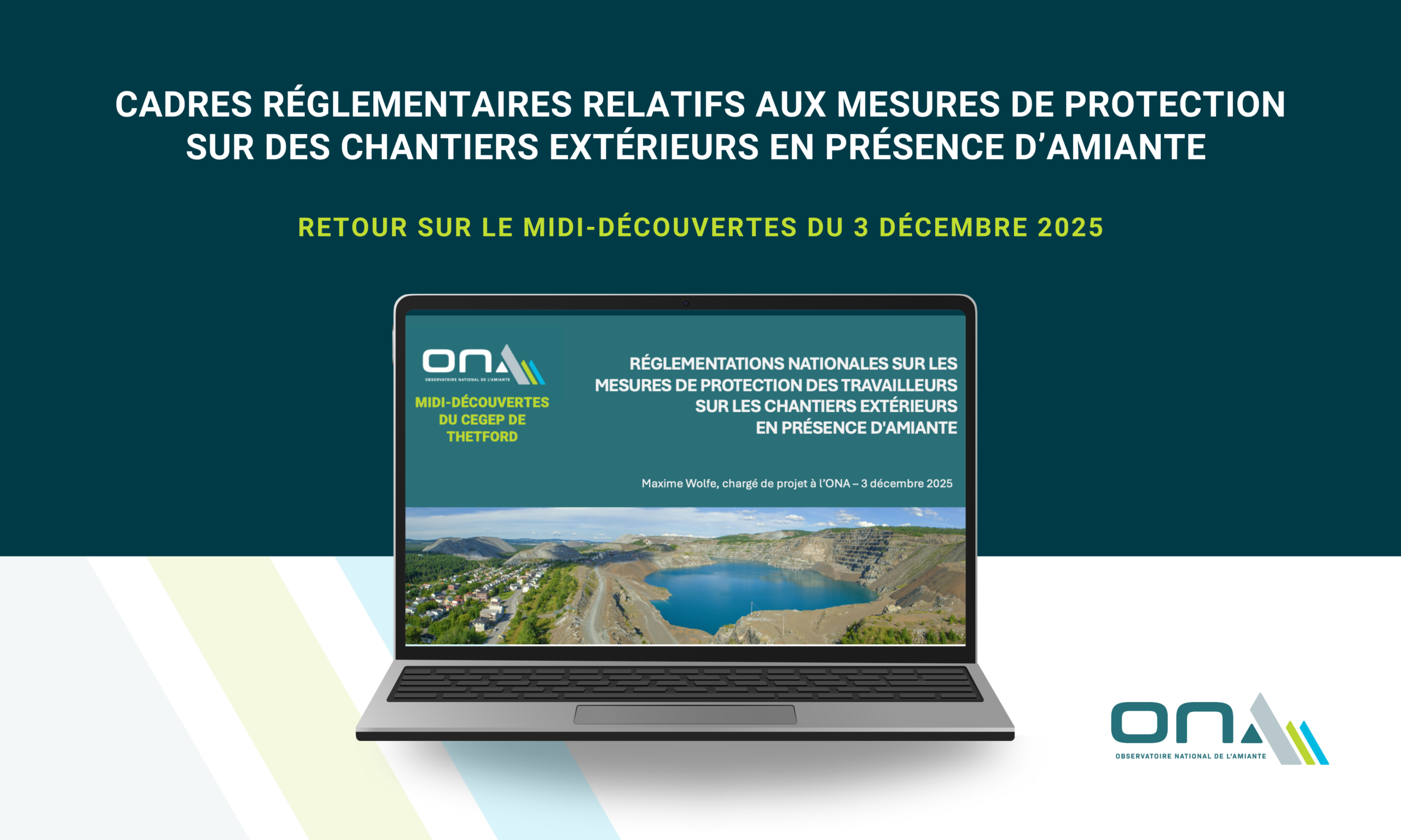 Le 3 décembre dernier, Maxime Wolfe, Enseignant au Cégep de Thetford et Chargé de projet à l’ONA, présentait une conférence portant sur « Les réglementations nationales sur les mesures de protection des travailleurs sur les chantiers extérieurs en présence d’amiante ».