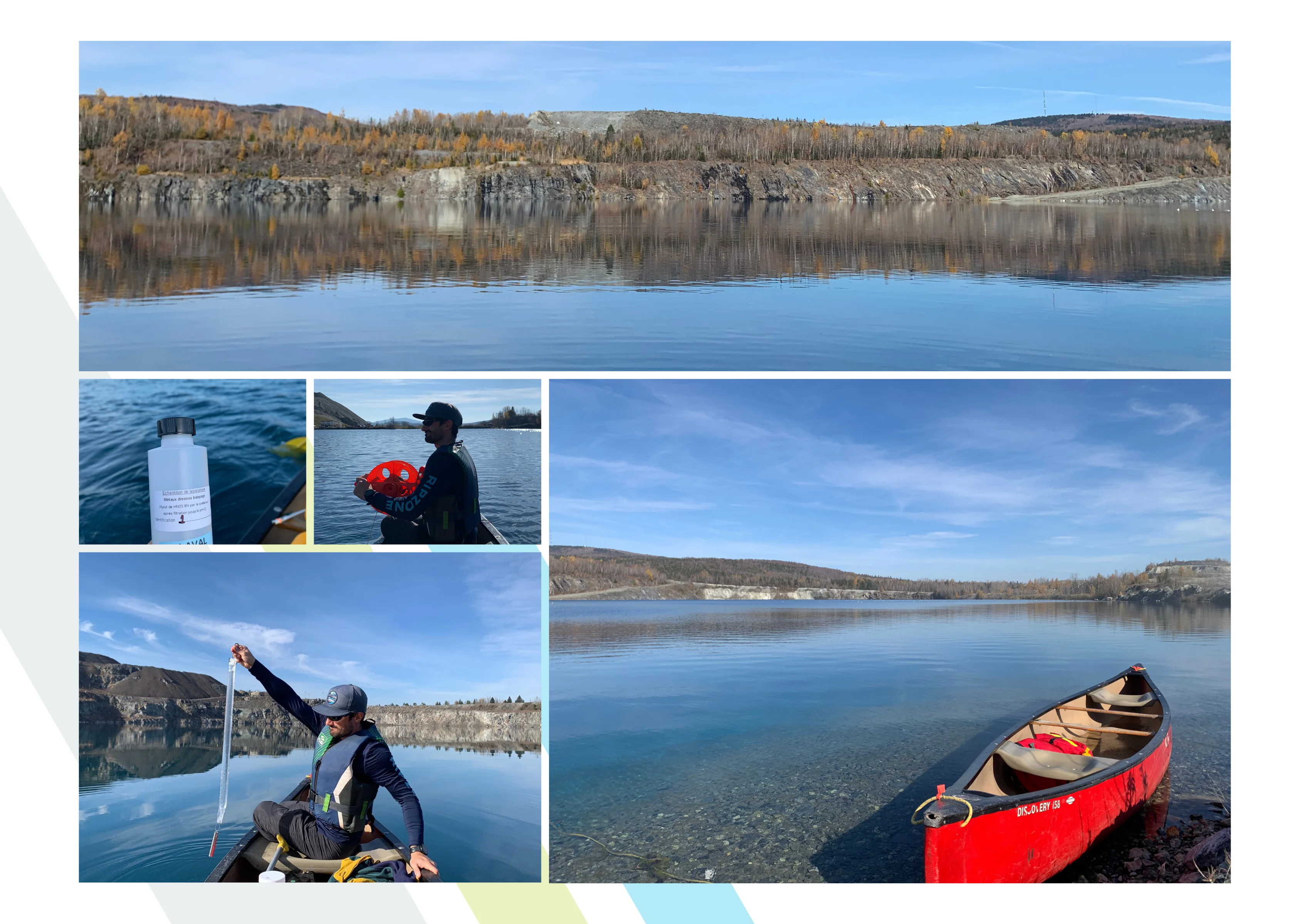 C’est vraiment agréable d’effectuer des travaux de recherche à l’extérieur, sur l’eau. En plus on a accès à d’immenses plans d’eau qui ne sont pas accessibles pour le public. Je m’estime chanceux de pouvoir étudier d’anciens sites miniers comme ça. La plupart des lacs de mine sont bien protégés du vent avec des falaises sur une majorité des rives. Il y vente peu et s’est très facile de s’y déplacer en canot.