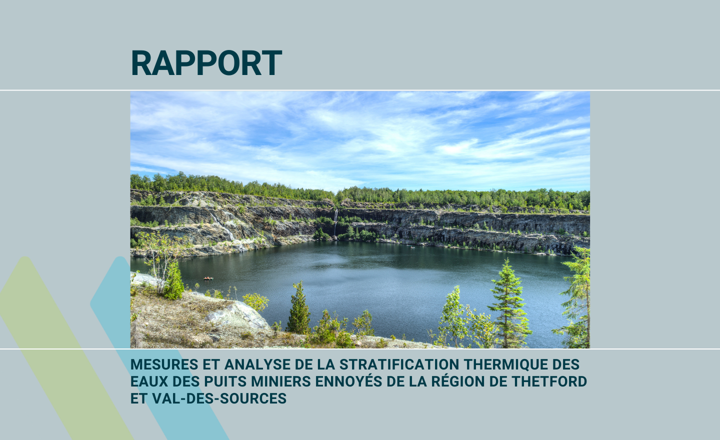 Les résultats des travaux entourant les mesures et analyse de la stratification thermique des eaux des puits miniers ennoyés de la région de Thetford et de Val-des-Sources sont maintenant disponibles.