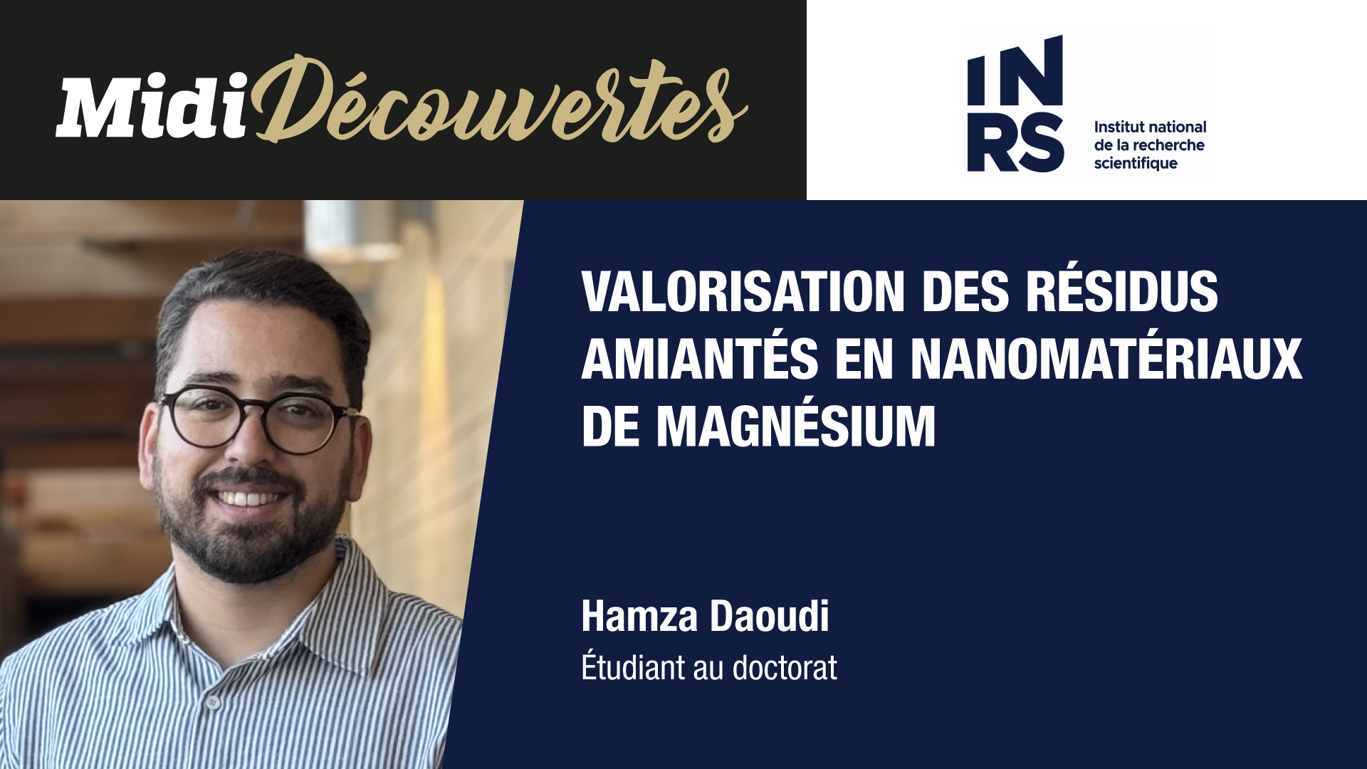 Ce rendez-vous virtuel des Midi-Découvertes était consacré à la valorisation des résidus amiantés en nanomatériaux de magnésium. Cette conférence, présentée par Hamza Daoudi, Étudiant au doctorat, Institut national de la recherche scientifique, a permis d’en apprendre davantage sur des approches innovantes de revalorisation des matériaux et leurs applications potentielles.