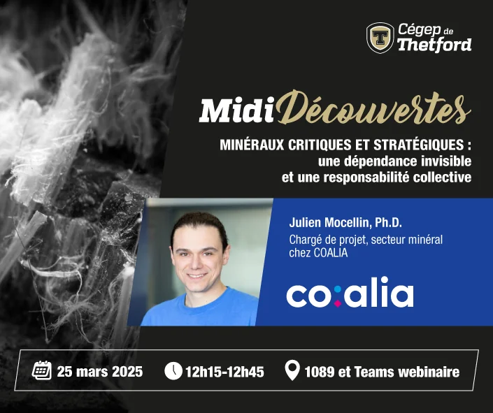 L’Observatoire national de l’amiante et le Cégep de Thetford vous invitent au prochain prochain rendez-vous des Midi-Découvertes. La rencontre aura lieu le 25 mars prochain et sera présentée par Julien Mocellin, Ph.D. Chargé de projet, secteur minéral chez COALIA.