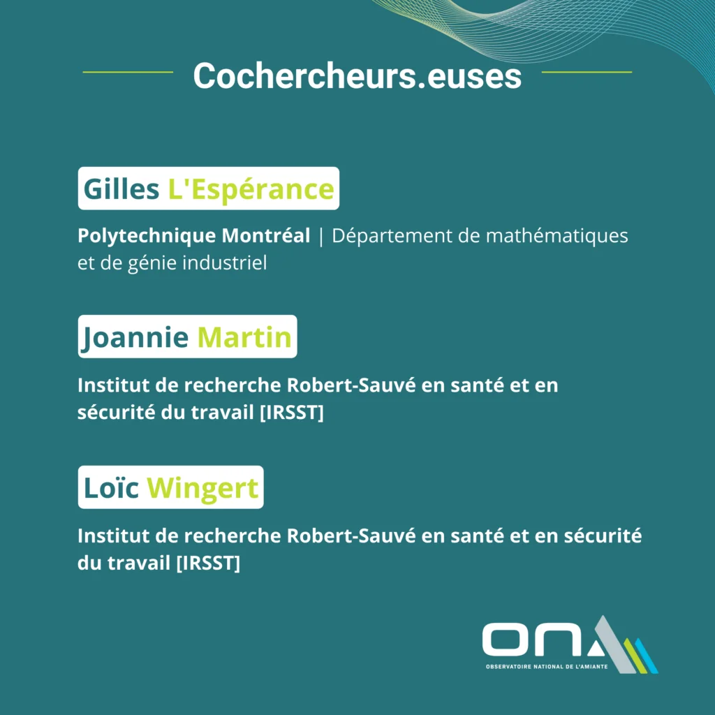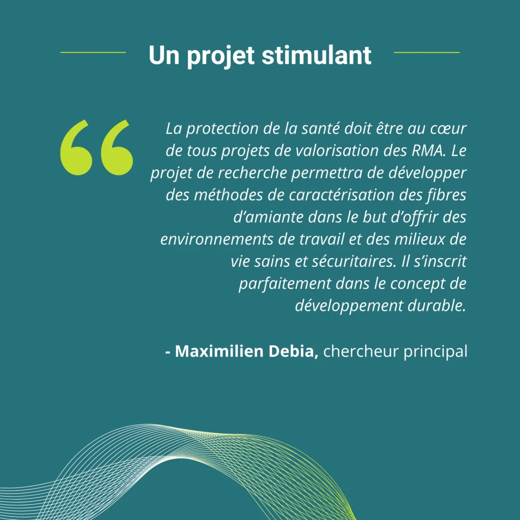 Le projet de Maximilien, ainsi que ses cochercheurs.euses, porte le titre de : « Approches novatrices pour la caractérisation et la numération des fibres d’amiante dans l’évaluation de l’exposition professionnelle en contexte de mobilisation des résidus miniers amiantés (RMA) »